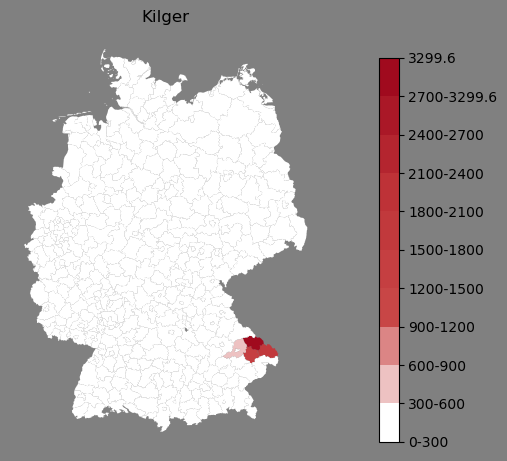 Relative Verteilung des Namens Kilger (1996)Direkt zur Karte Die Farbskala zeigt die Anzahl von "Kilger" bezogen auf je 1 Million Einträge. |