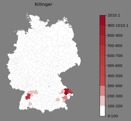 Absolute Verteilung des Namens Killinger (1890)Direkt zur Karte Absolute Verteilung des Namens "Killinger" um 1890 im damaligen Deutschen Reich Sie können die Karte innerhalb des Fensters zoomen und verschieben. |