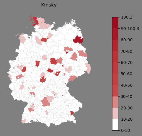Relative Verteilung des Namens Kinsky (1996)Direkt zur Karte Die Farbskala zeigt die Anzahl von "Kinsky" bezogen auf je 1 Million Einträge. |