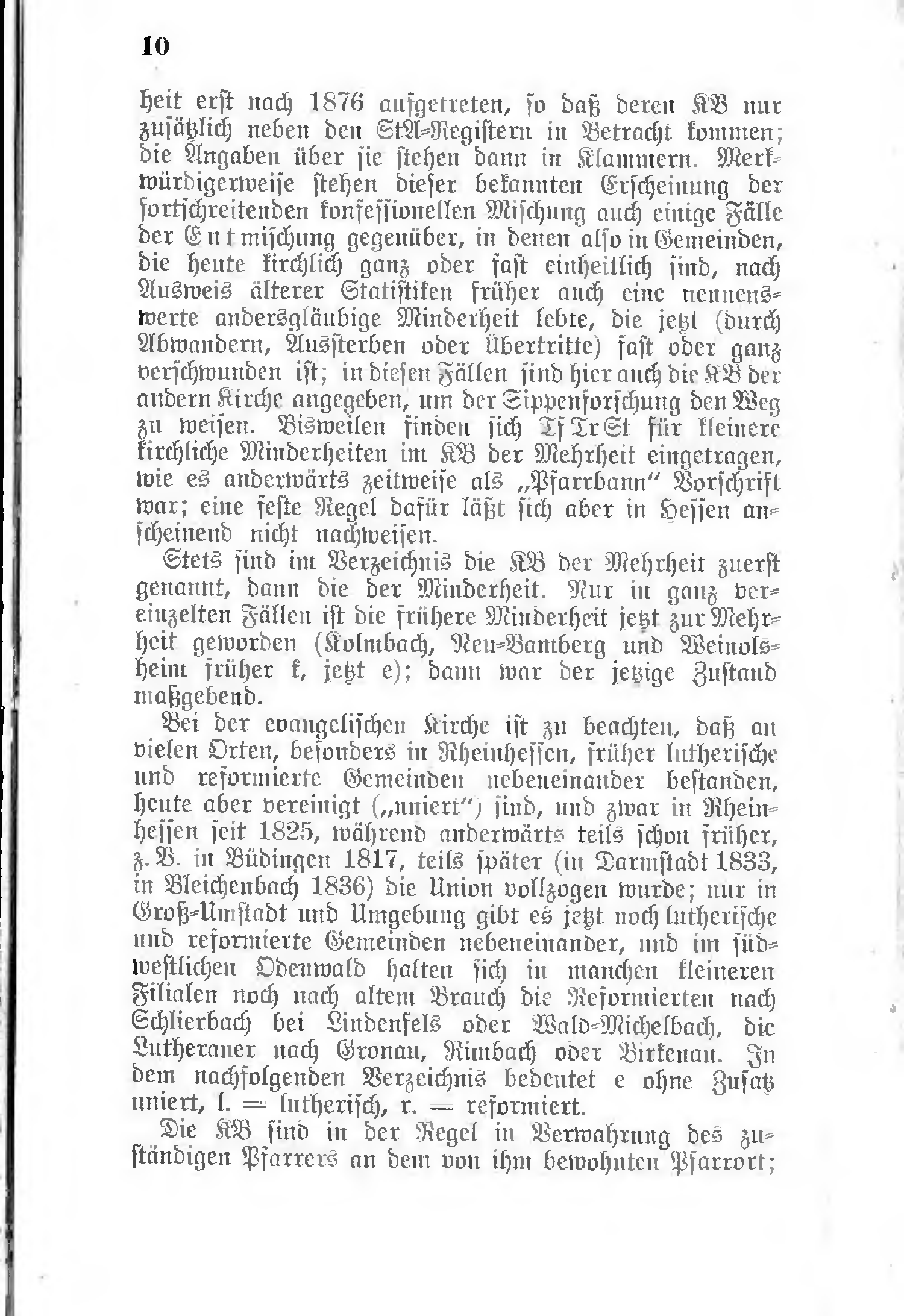 Bei der evangelischen Kirche ist zu beachten, daß an vielen Orten, besonders in Rheinhessen, früher lutherische und reformierte Gemeinden nebeneinander bestanden, heute aber vereinigt ("uniert") sind, und zwar in Rheinhessen seit 1825, während anderwärts teils schon früher, z. B. in Büdingen 1817, teils später (in Darmstadt 1833, in Bleichenbach 1836) die Union vollzogen wurde; nur in Groß-Umstadt und Umgebung gibt es jetzt noch lutherische und reformierte Gemeinden nebeneinander, und im südwestlichen Odenwald halten sich in manchen kleineren Filialen noch nach altem Brauch die Reformierten nach Schlierbach bei Lindenfels oder Wald-Michelbach, die Lutheraner nach Gronau, Rimbach oder Birkenau. In dem nachfolgenden Verzeichnis bedeutet e ohne Zusatz uniert, l. = lutherisch, r. = reformiert.