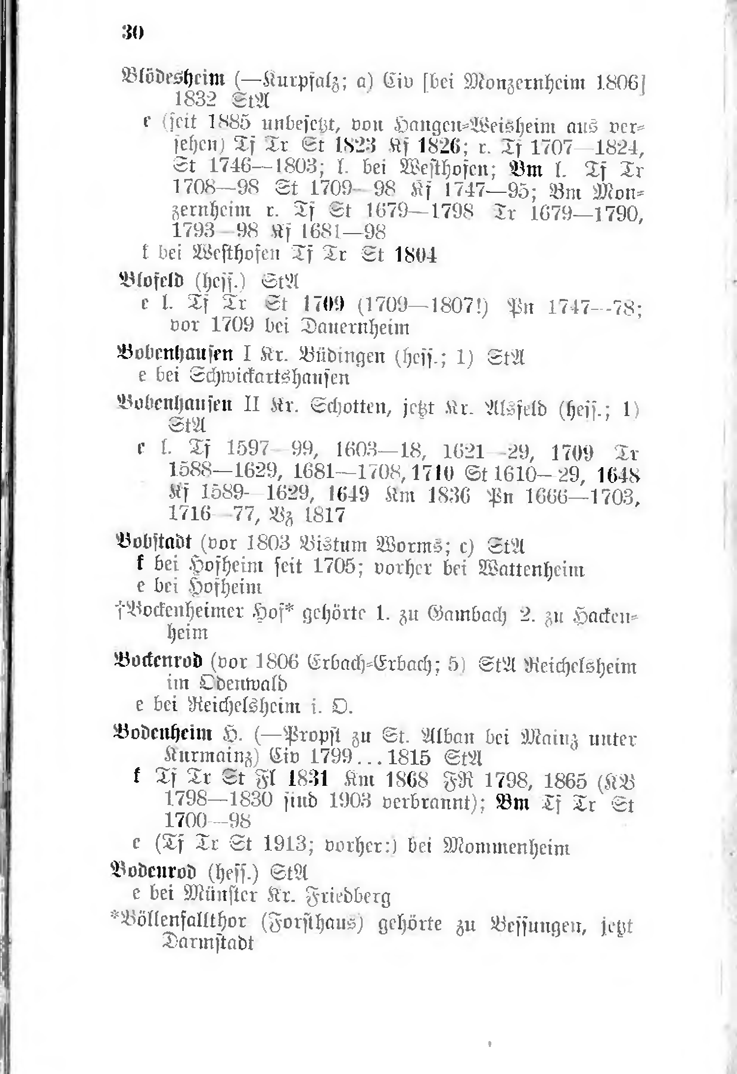 - e (seit 1885 unbesetzt, von Hangen-Weisheim aus versehen) Tf Tr St 1823 Kf 1826; r. Tf 1707–1824, St 1746–1803; l. bei Westhofen; Bm l. Tf Tr 1708–98 St 1709–98 Kf 1747–95; Bm Monzernheim r. Tf St 1679–1798 Tr 1679–1790, 1793–98 Kf 1681–98