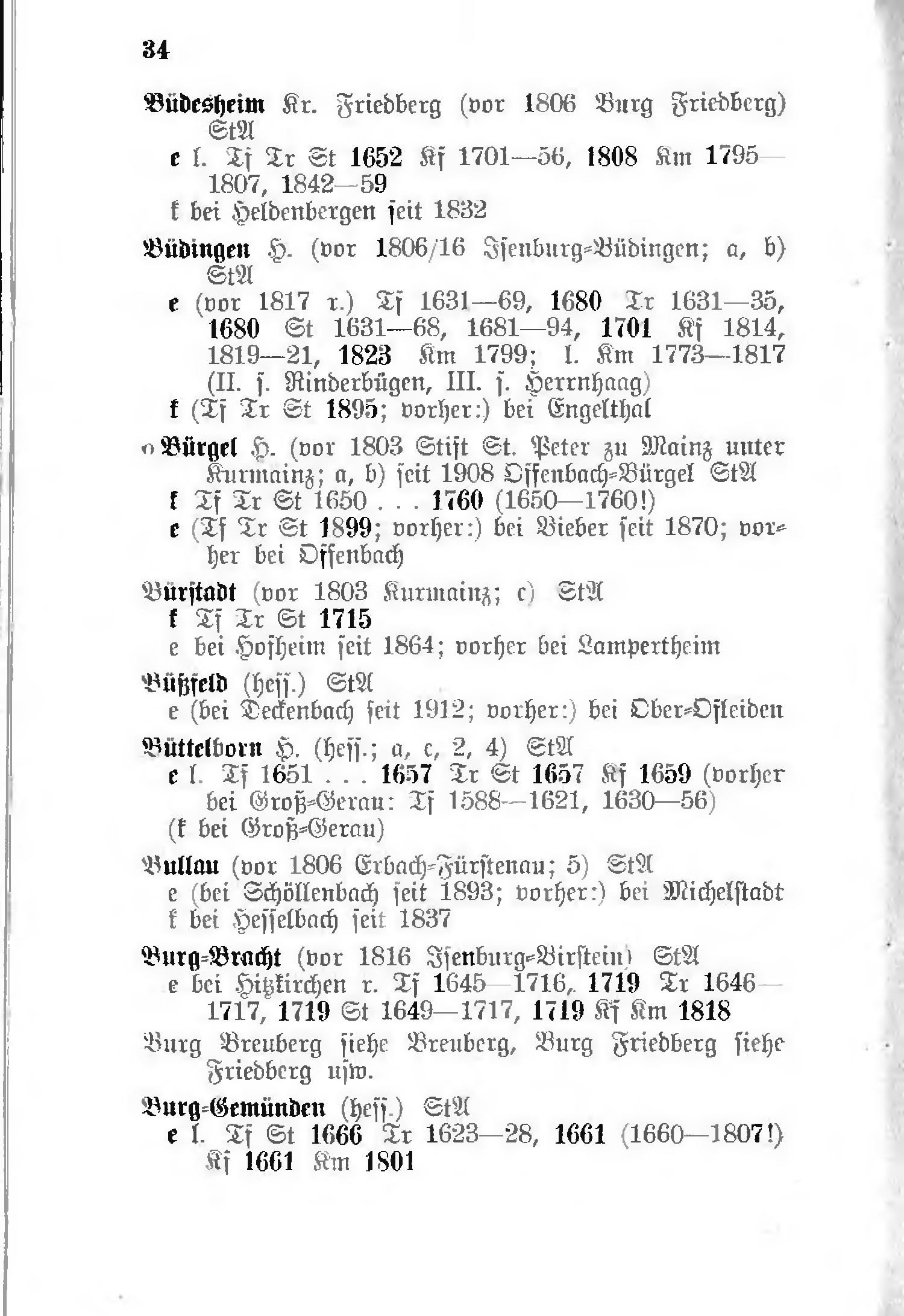 - e (vor 1817 r.) Tf 1631–69, 1680 Tr 1631–35, 1680 St 1631–68, 1681–94, 1701 Kf 1814, 1819–21, 1823 Km 1799; l. Km 1773–1817 (II. s. Rinderbügen, III. s. Herrnhaag)