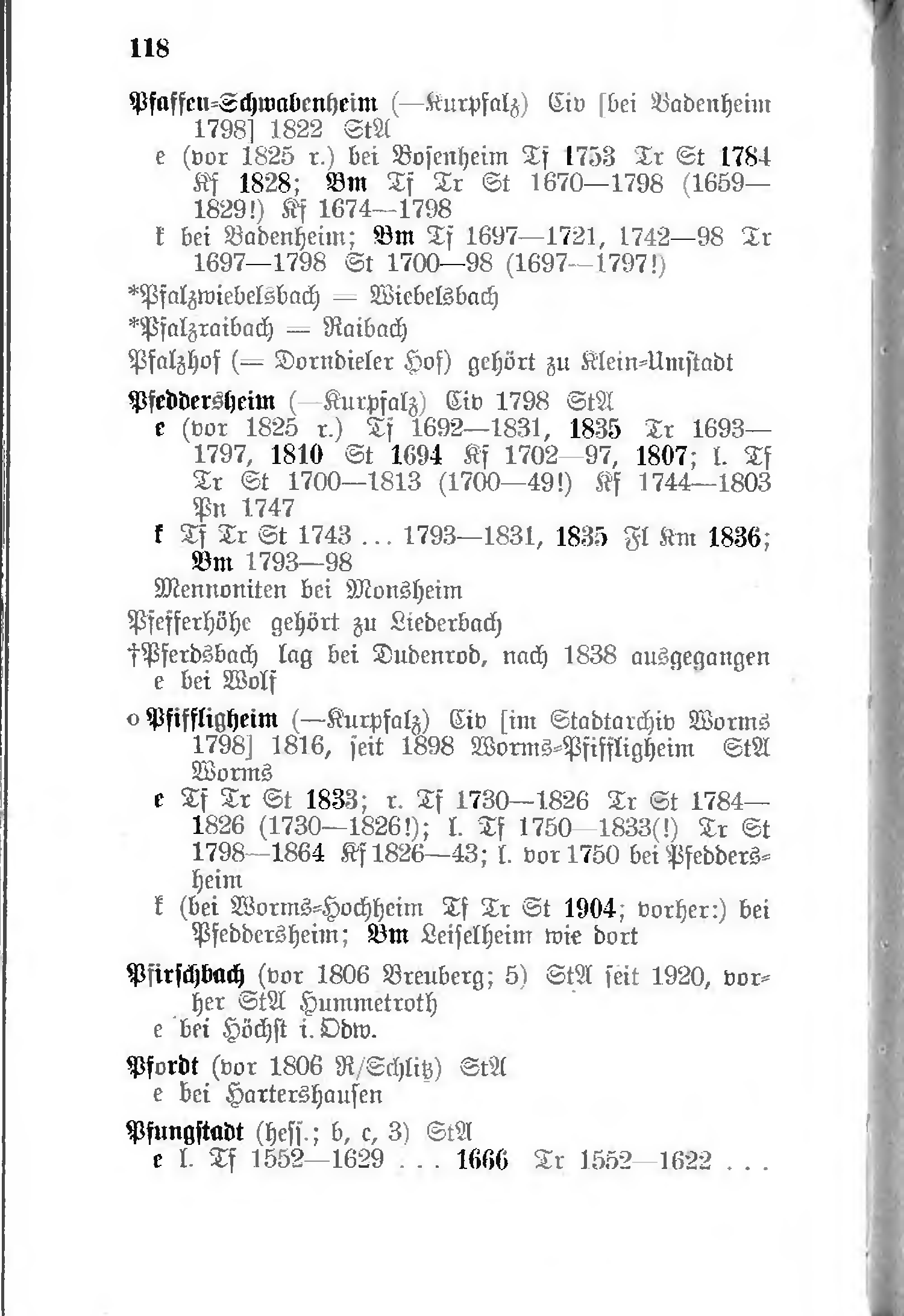 - e Tf Tr St 1833; r. Tr 1730–1826 Tr St 1784–1826 (1730–1826!); l Tf 1750–1833(!) Tr St 1798–1864 Kf 1826–43; l. vor 1750 bei Pfeddersheim