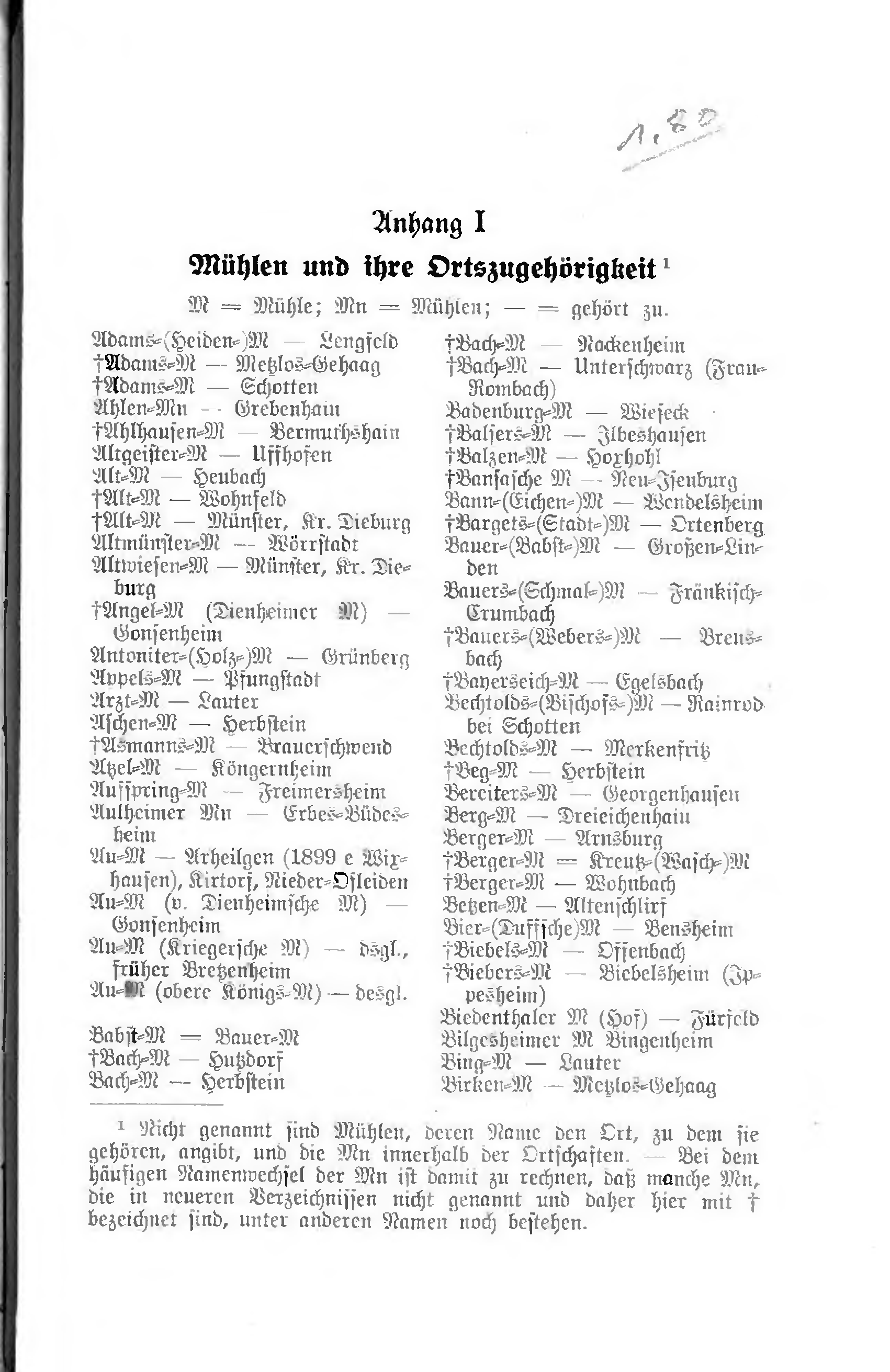 - ↑ Nicht genannt sind Mühlen, deren Name den Ort, zu dem sie gehören, angibt, und die Mn innerhalb der Ortschaften. - Bei dem häufigen Namenswechsel der Mn ist damit zu rechnen, daß manche Mn, die in neueren Verzeichnissen nicht genannt und daher hier mit † bezeichnt sind, unter anderen Namen noch bestehen.