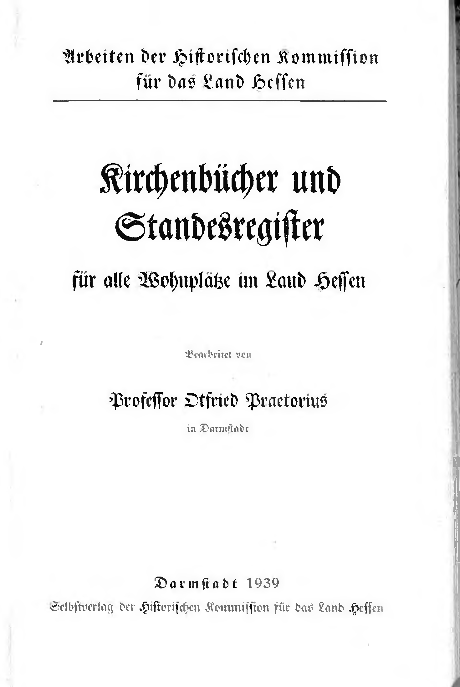 Standesregister für alle Wohnplätze im Land Hessen Bearbeitet von Professor Otfried Praetorius[1] in Darmstadt