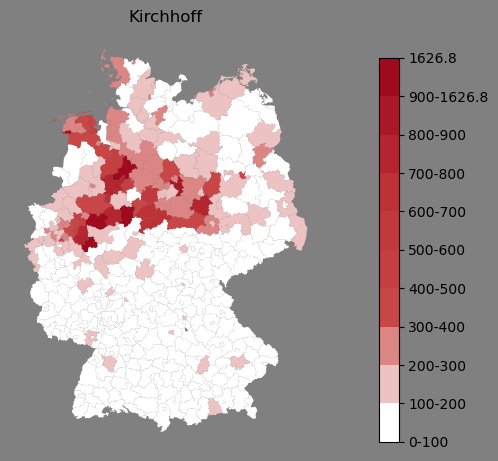 Absolute Verteilung des Namens Kirchhoff (1890)Direkt zur Karte Absolute Verteilung des Namens "Kirchhoff" um 1890 im damaligen Deutschen Reich Sie können die Karte innerhalb des Fensters zoomen und verschieben. |