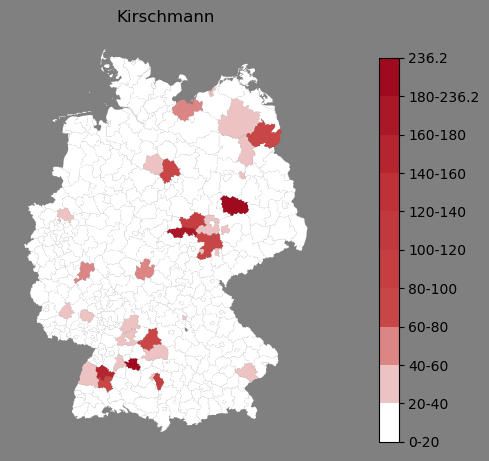 Absolute Verteilung des Namens Kirschmann (1890)Direkt zur Karte Absolute Verteilung des Namens "Kirschmann" um 1890 im damaligen Deutschen Reich Sie können die Karte innerhalb des Fensters zoomen und verschieben. |