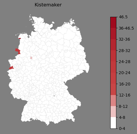 Relative Verteilung des Namens Kistemaker (1996)Direkt zur Karte Die Farbskala zeigt die Anzahl von "Kistemaker" bezogen auf je 1 Million Einträge. |