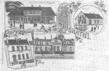 Jugnaten wurde 1875 an das Eisenbahnnetz angeschlossen. Die Eröffnung der Strecke von Tilsit nach Memel war für den 15. Mai 1875 vorgesehen. Da aber die große Memelbruecke in Tilsit erst im Herbst 1875 fertiggestellt werden konnte, musste anfangs der Personen- und Güterverkehr von Tilsit bis Pogegen mit Fuhrwerken durchgeführt werden.