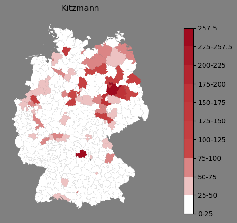 Relative Verteilung des Namens Kitzmann (1996)Direkt zur Karte Die Farbskala zeigt die Anzahl von "Kitzmann" bezogen auf je 1 Million Einträge. |
