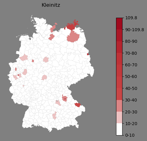 Relative Verteilung des Namens Kleinitz (1996)Direkt zur Karte Die Farbskala zeigt die Anzahl von "Kleinitz" bezogen auf je 1 Million Einträge. |