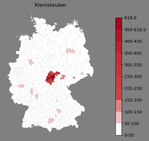 Relative Verteilung des Namens Kleinsteuber (1996)Direkt zur Karte Die Farbskala zeigt die Anzahl von "Kleinsteuber" bezogen auf je 1 Million Einträge. |