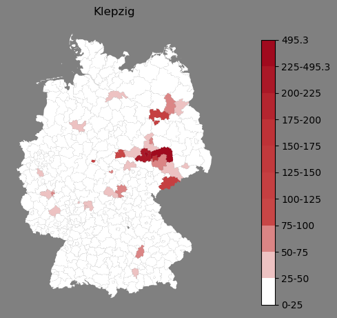 Relative Verteilung des Namens Klepzig (1996)Direkt zur Karte Die Farbskala zeigt die Anzahl von "Klepzig" bezogen auf je 1 Million Einträge. |