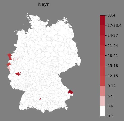 Absolute Verteilung des Namens Kleyn (1890)Direkt zur Karte Absolute Verteilung des Namens "Kleyn" um 1890 im damaligen Deutschen Reich Sie können die Karte innerhalb des Fensters zoomen und verschieben. |
