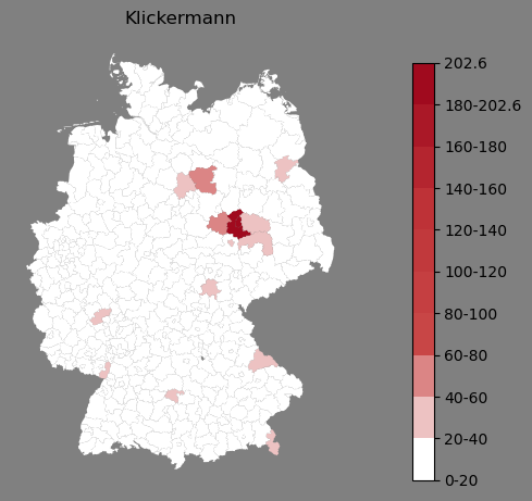 Relative Verteilung des Namens Klickermann (1996)Direkt zur Karte Die Farbskala zeigt die Anzahl von "Klickermann" bezogen auf je 1 Million Einträge. |