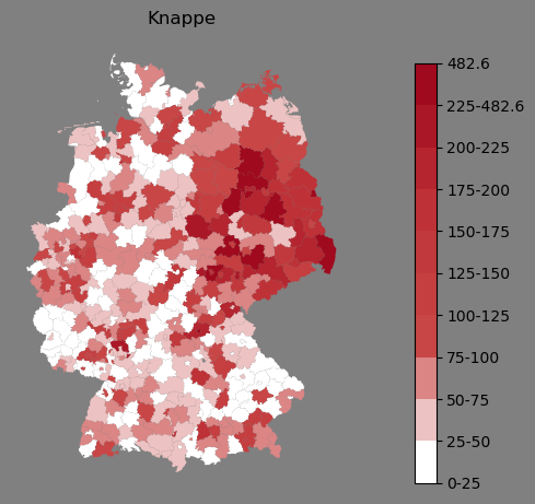 Relative Verteilung des Namens Knappe (1996)Direkt zur Karte Die Farbskala zeigt die Anzahl von "Knappe" bezogen auf je 1 Million Einträge. |