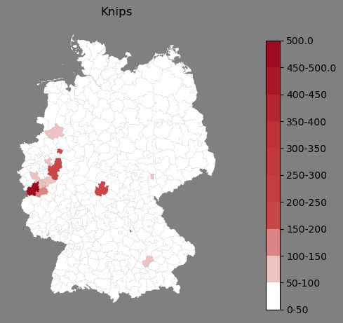 Relative Verteilung des Namens Knips (1996)Direkt zur Karte Die Farbskala zeigt die Anzahl von "Knips" bezogen auf je 1 Million Einträge. |