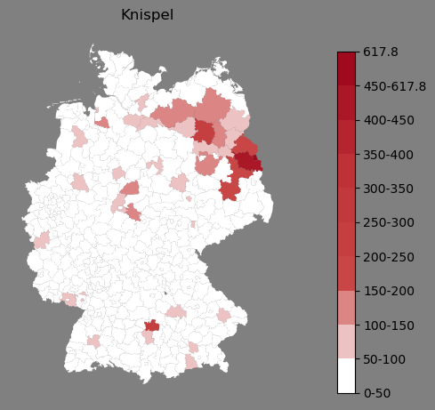 Relative Verteilung des Namens Knispel (1996)Direkt zur Karte Die Farbskala zeigt die Anzahl von "Knispel" bezogen auf je 1 Million Einträge. |