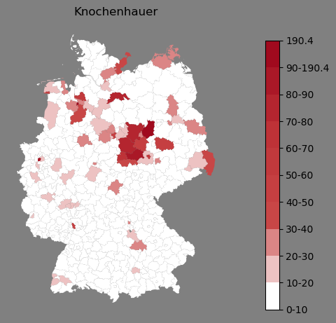 Relative Verteilung des Namens Knochenhauer (1996)Direkt zur Karte Die Farbskala zeigt die Anzahl von "Knochenhauer" bezogen auf je 1 Million Einträge. |