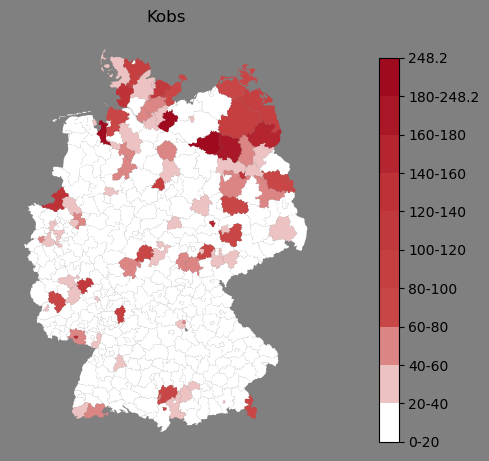 Relative Verteilung des Namens Kobs (1996)Direkt zur Karte Die Farbskala zeigt die Anzahl von "Kobs" bezogen auf je 1 Million Einträge. |