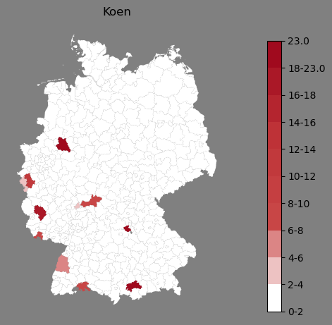 Relative Verteilung des Namens Koen (1996)Direkt zur Karte Die Farbskala zeigt die Anzahl von "Koen" bezogen auf je 1 Million Einträge. |
