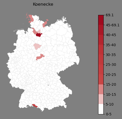 Relative Verteilung des Namens Koenecke (1996)Direkt zur Karte Die Farbskala zeigt die Anzahl von "Koenecke" bezogen auf je 1 Million Einträge. |