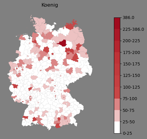 Absolute Verteilung des Namens Koenig (1890)Direkt zur Karte Absolute Verteilung des Namens "Koenig" um 1890 im damaligen Deutschen Reich Sie können die Karte innerhalb des Fensters zoomen und verschieben. |