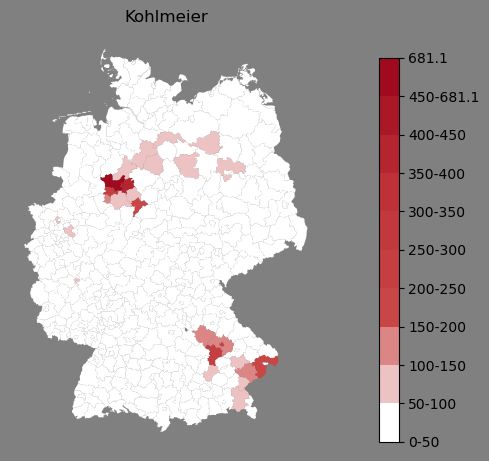 Absolute Verteilung des Namens Kohlmeier (1890)Direkt zur Karte Absolute Verteilung des Namens "Kohlmeier" um 1890 im damaligen Deutschen Reich Sie können die Karte innerhalb des Fensters zoomen und verschieben. |