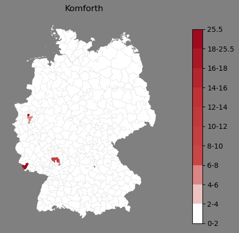 Relative Verteilung des Namens Komforth (1996)Direkt zur Karte Die Farbskala zeigt die Anzahl von "Komforth" bezogen auf je 1 Million Einträge. |
