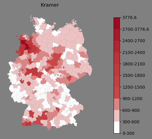 Relative Verteilung des Namens Kramer (1996)Direkt zur Karte Die Farbskala zeigt die Anzahl von "Kramer" bezogen auf je 1 Million Einträge. |