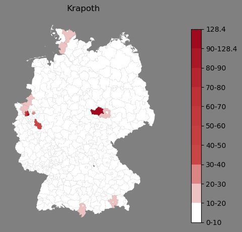 Relative Verteilung des Namens Krapoth (1996)Direkt zur Karte Die Farbskala zeigt die Anzahl von "Krapoth" bezogen auf je 1 Million Einträge. |