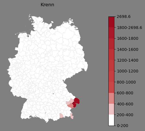 Relative Verteilung des Namens Krenn (1996)Direkt zur Karte Die Farbskala zeigt die Anzahl von "Krenn" bezogen auf je 1 Million Einträge. |