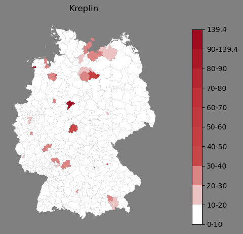 Relative Verteilung des Namens Kreplin (1996)Direkt zur Karte Die Farbskala zeigt die Anzahl von "Kreplin" bezogen auf je 1 Million Einträge. |