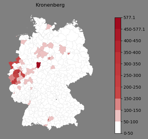 Relative Verteilung des Namens Kronenberg (1996)Direkt zur Karte Die Farbskala zeigt die Anzahl von "Kronenberg" bezogen auf je 1 Million Einträge. |
