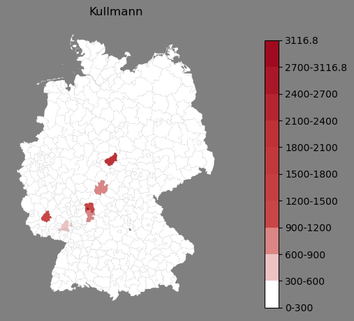 Absolute Verteilung des Namens Kullmann (1890)Direkt zur Karte Absolute Verteilung des Namens "Kullmann" um 1890 im damaligen Deutschen Reich Sie können die Karte innerhalb des Fensters zoomen und verschieben. |