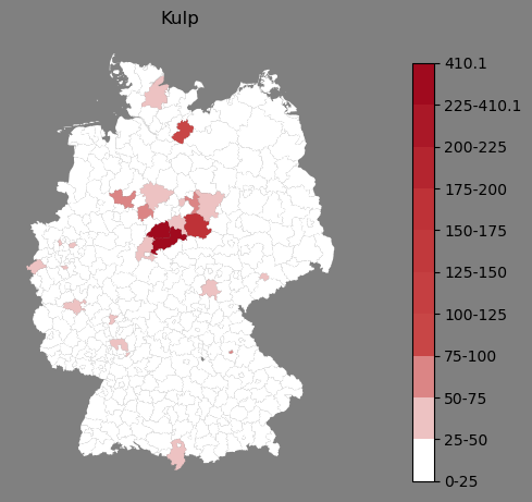 Absolute Verteilung des Namens Kulp (1890)Direkt zur Karte Absolute Verteilung des Namens "Kulp" um 1890 im damaligen Deutschen Reich Sie können die Karte innerhalb des Fensters zoomen und verschieben. |