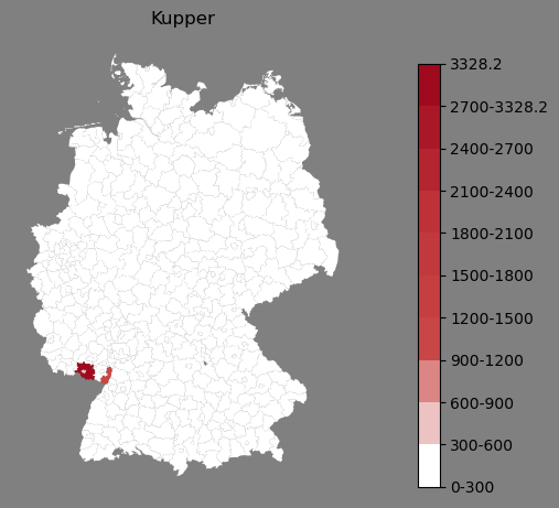 Relative Verteilung des Namens Kupper (1996)Direkt zur Karte Die Farbskala zeigt die Anzahl von "Kupper" bezogen auf je 1 Million Einträge. |