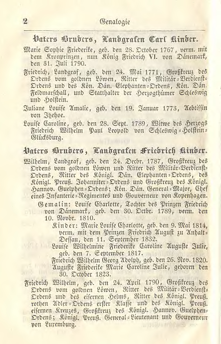 Wilhelm, Landgraf, geb. den 24. Decbr. 1787, Großkreuz des Ordens vom goldnen Löwen und Ritter des Militär-Verdienst-Ordens, Ritter des Königl. Dän. Elephanten-Ordens, des Königl. Preuß. Johanniter-Ordens und Großkreuz des Königl. Hannov. Guelphen-Ordens; Kön. Dän. General-Major, Chef eines Infanterie-Regimentes und Gouverneur von Kopenhagen.