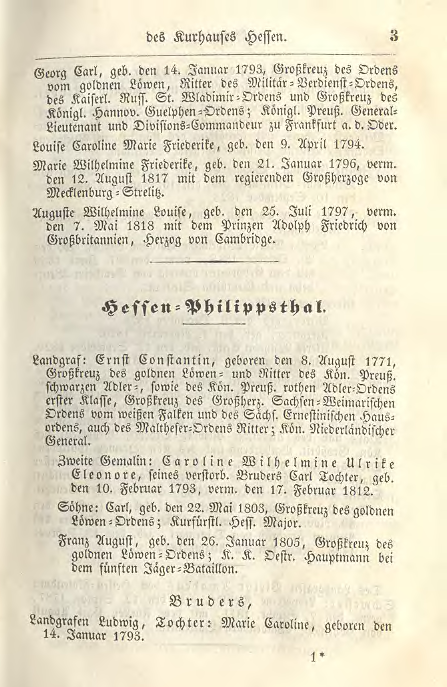 Söhne: Carl, geb. den 22. Mai 1803, Großkreuz des goldnen Löwen-Ordens; Kurfürstl. Hess. Major.