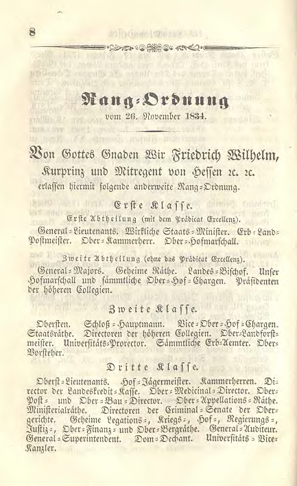 Oberst-Lieutnants. Hof-Jägermeister. Kammerherren. Director der Landeskredit-Kasse. Ober-Medicinal-Director. Ober-Post- und Ober-Bau-Director. Ober-Appellations-Räthe. Ministerialräthe. Directoren der Criminal-Senate der Obergerichte. Geheime Legations-, Kriegs-, Hof-, Regierung-, Justiz-, Ober-Finanz- und Ober-Bergräthe. General-Auditeur. General-Superintendent. Dom-Dechant. Universitäts-Vice-Kanzler.