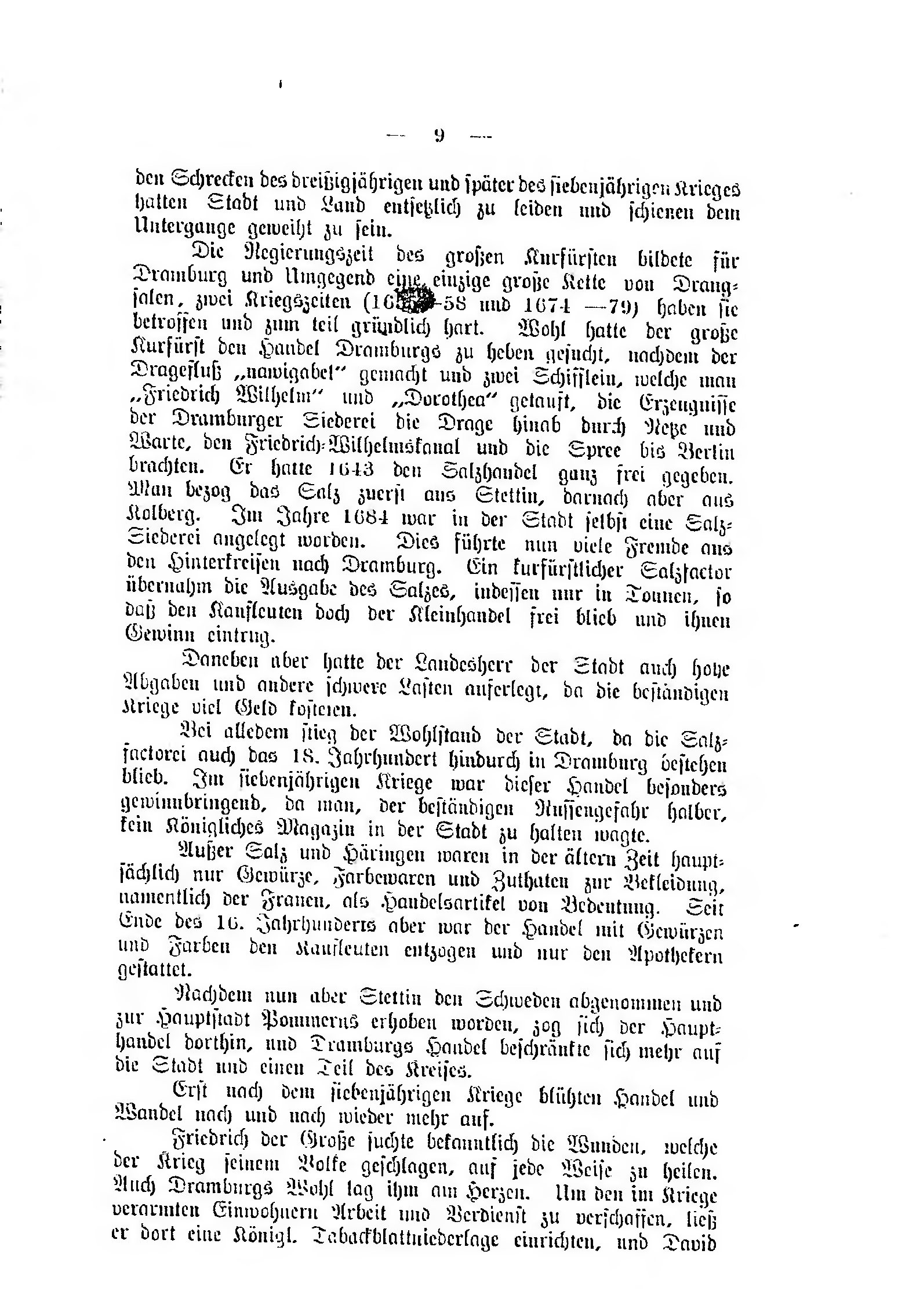 Die Regierungszeit des großen Kurfürsten bildete für Dramburg und Umgebung eine einzige große Kette von Drangsalen, zwei Kriegszeiten (1655 - 58 und 1674 - 79) haben sie betroffen und zum teil gründlich hart. Wohl hatte der große Kurfürst den Handel Dramburgs zu heben gesucht, nachdem der Dragefluß „nawigabel“ gemacht und zwei Schifflein, welche man „Friedrich Wilhelm“ und „Dorothea“ getauft, die Erzeugnisse der Dramburger Siederei die Drage hinab durch Netze und Warte, den Friedrich-Wilhelmskanal und die Spree bis Berlin brachten. Er hatte 1613 den Salzhandel ganz frei gegeben. Man bezog das Salz zuerst aus Stettin, darnach aber aus Kolberg. Im Jahre 1684 war in der Stadt selbst eine Salz-Siederei angelegt worden. Dies führte nun viele Fremde aus den Hinterkreisen nach Dramburg. Ein kurfürstlicher Salzfactor übernahm die Ausgabe des Salzes, indessen nur in Tonnen, so daß den Kaufleuten doch der Kleinhandel frei blieb und ihnen Gewinn eintrug.