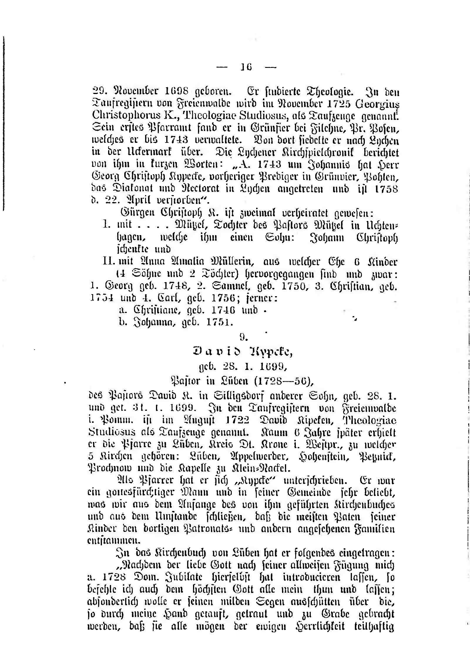 des Pastors David K. in Silligsdorf anderer Sohn, geb. 28. 1. und get. 31. 1. 1699. In den Taufregistern von Freienwalde i. Pomm. ist im August 1722 David Kipeken, Theologiae Studiosus als Taufzeuge genannt. Kaum 6 Jahre später erhielt er die Pfarre zu Lüben, Kreis Dt. Krone i. Westpr., zu welcher 5 Kirchen gehören: Lüben, Appelwerder, Hohenstein, Petznick, Prochnow und die Kapelle zu Klein-Rackel.