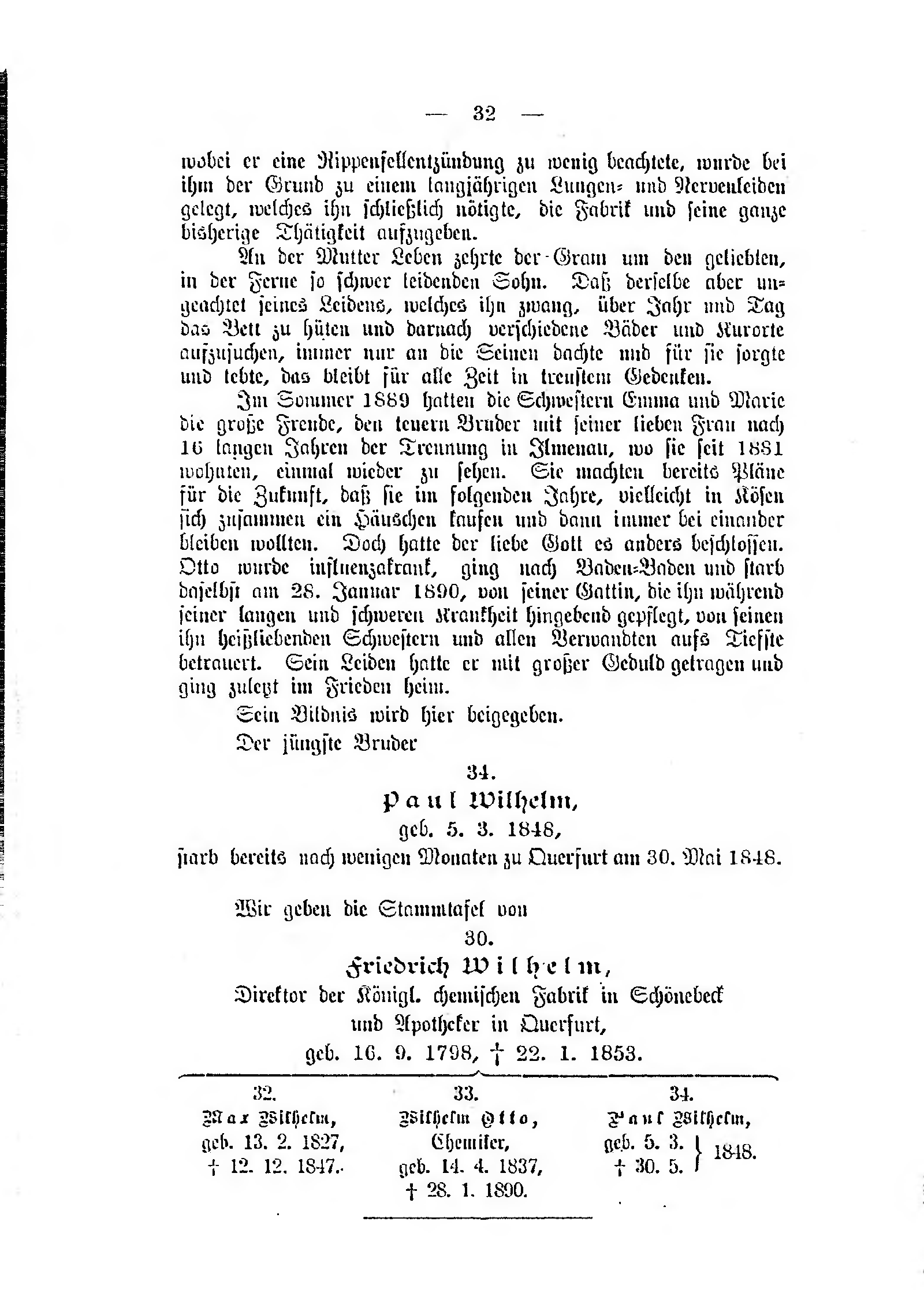 | 30. Friedrich Wilhelm, Direktor der Königl. chemischen Fabrik in Schönebeck und Apotheker in Querfurt, geb. 16. 9. 1798, + 22. 1. 1853. | |||||||||||