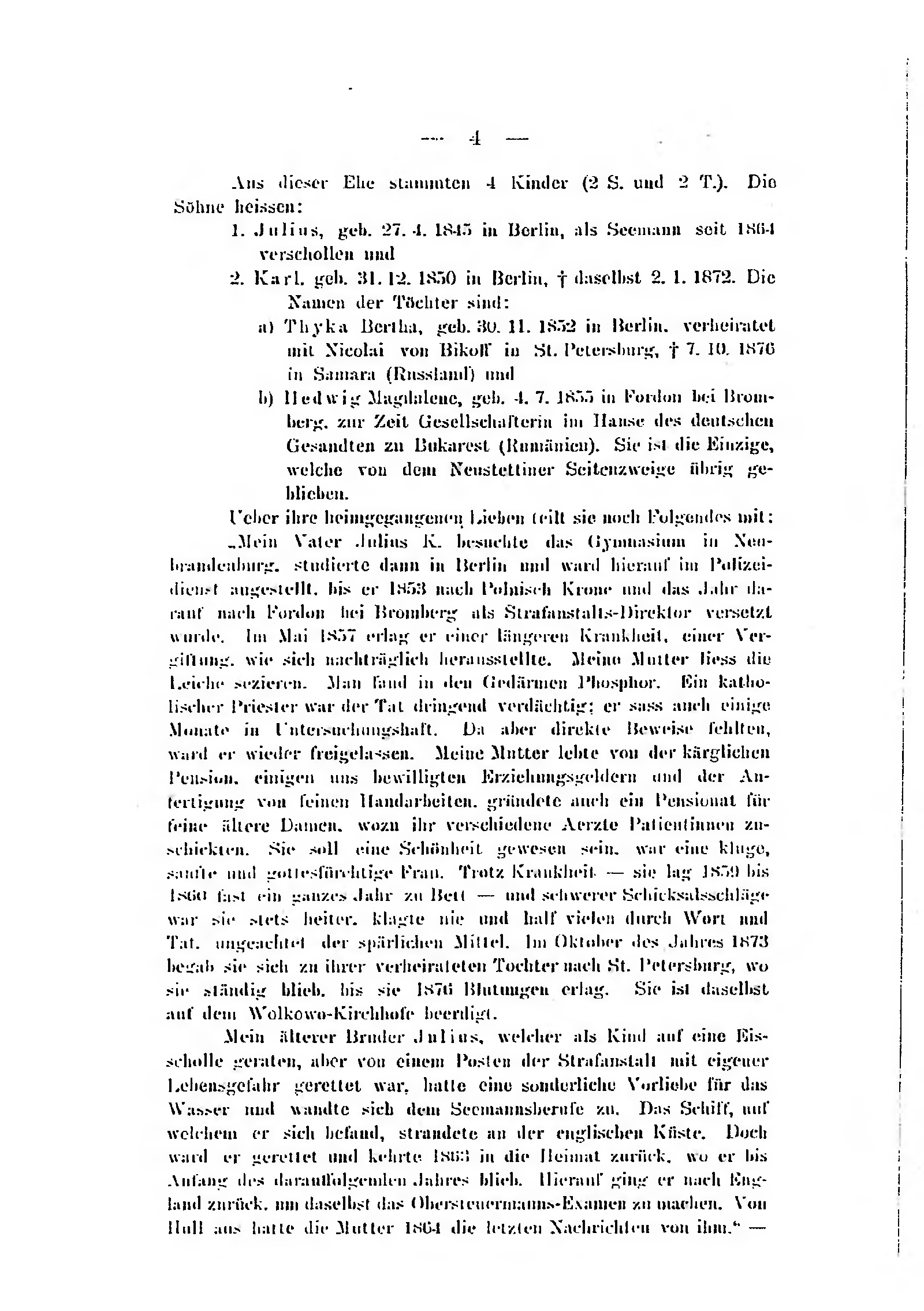 „Mein Vater Julius K. besuchte das Gymnasium in Neubrandenburg, studierte dann in Berlin und ward hierauf im Polizeidienst angestellt, bis er 1853 nach Polnisch Krone und das Jahr da¬rauf nach Fordon hei Bromherg als Strafanstalts-Direktor versetzt wurde. Im Mai 1857 erlag er einer längeren Krankheit, einer Ver¬giftung, wie sich nachträglich herausstellte. Meine Mutter liess die Leiche sezieren. Man fand in den Gedärmen Phosphor. Ein katho¬lischer Priester war der Tat dringend verdächtig: er sass auch einige Monate in Untersuchungsshaft. Da aber direkte Beweise fehlten, ward er wieder freigelassen. Meine Mutter lebte von der kärglichen Pension, einigen uns bewilligten Erziehungsgeldern und der Anfertigung von feinen Handarbeiten, gründete auch ein Pensionat für feine ältere Damen, wozu ihr verschiedene Aerzte Patientinnen zuschickten. Sie soll eine Schönheit gewesen sein, war eine kluge, sanfte und gottesfürchtige Frau. Trotz Krankheit - sie lag 1859 bis 1860 fast ein ganzes Jahr zu Bett - und schwerer Schicksalsschläge war sie stets heiter, klagte nie und half vielen durch Wort und Tat, ungeachtet der spärlichen Mittel. Im Oktober des Jahres 1873 begab sie sich zu ihrer verheirateten Tochter nach St. Petersburg, wo sie ständig blieb, bis sie 1873 Blutungen erlag. Sie ist daselbst auf dem Wolkowo-Friedhofe beerdigt.