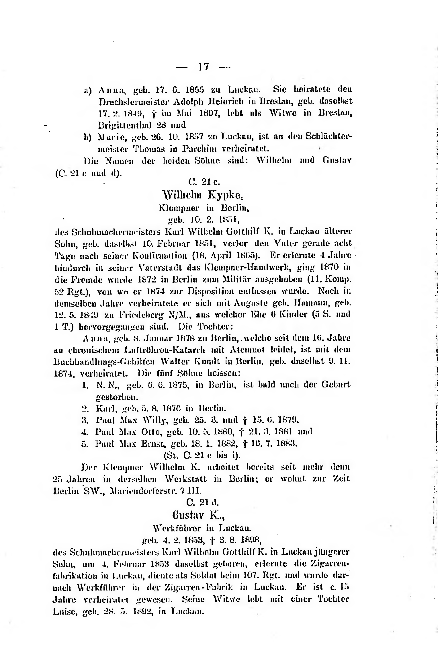 des Schuhmachermeisters Karl Wilhelm Gotthilf K. in Luckau jüngerer Sohn, am 4. Februar 1853 daselbst geboren, erlernte die Zigarrenfabrikation in Lurkau, diente als Soldat beim 107. Rgt. und wurde darnach Werkführer in der Zigarren-Fabrik in Luckau. Er ist c. 15 Jahre verheiratet gewesen. Seine Witwe lebt mit einer Tochter Luise, geb. 28. 5. 1892, in Luckau.