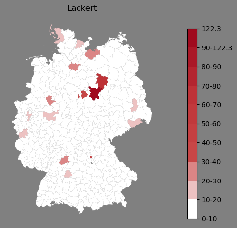 Absolute Verteilung des Namens Lackert (1890)Direkt zur Karte Absolute Verteilung des Namens "Lackert" um 1890 im damaligen Deutschen Reich Sie können die Karte innerhalb des Fensters zoomen und verschieben. |