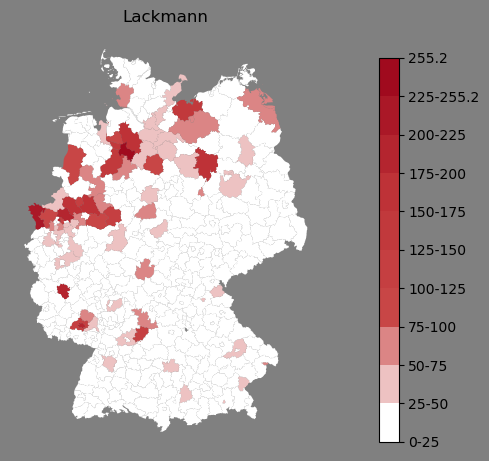 Relative Verteilung des Namens Lackmann (1996)Direkt zur Karte Die Farbskala zeigt die Anzahl von "Lackmann" bezogen auf je 1 Million Einträge. |