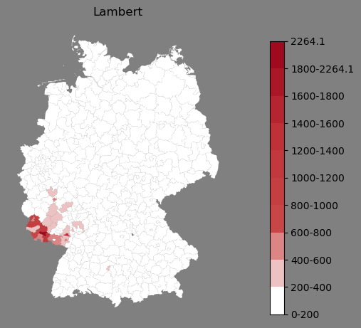 Absolute Verteilung des Namens Lambert (1890)Direkt zur Karte Absolute Verteilung des Namens "Lambert" um 1890 im damaligen Deutschen Reich Sie können die Karte innerhalb des Fensters zoomen und verschieben. |