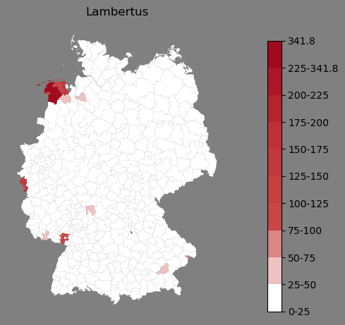 Relative Verteilung des Namens Lambertus (1996)Direkt zur Karte Die Farbskala zeigt die Anzahl von "Lambertus" bezogen auf je 1 Million Einträge. |