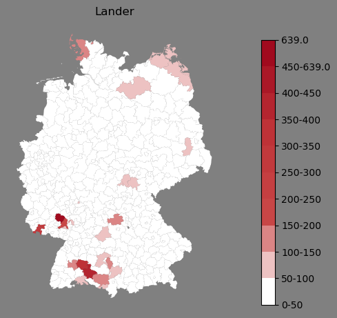 Relative Verteilung des Namens Lander (1996)Direkt zur Karte Die Farbskala zeigt die Anzahl von "Lander" bezogen auf je 1 Million Einträge. |